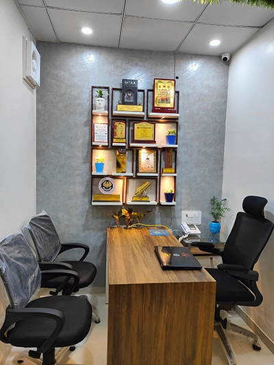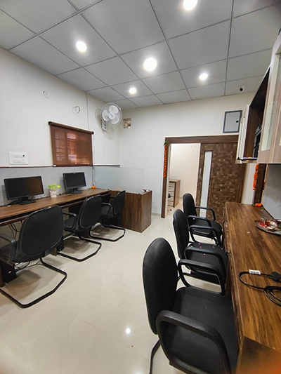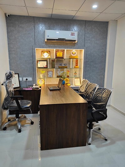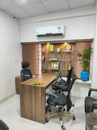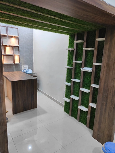 This small office is spread over 1800 sq feet. Since, it's a small office and was in a 40 year old Residential house, it was a challenge to renovate it without disturbing the original structure. Being a CA's office, space management for staff and stuff was a mandate as a result not a single inch of space was left unused. As a firm that works with finance professionals, for their new office they wanted a space that was more dynamic and vibrant than the older offices. They wanted to flatten the hierarchy that existed amongst the colleagues and create an environment, which would be more conducive to social interaction. The two partner's cabin were designed in the manner that for a bigger meetings both cabins can be used as one by just opening the glass door. An artificial green wall was designed and formed the highlight of the cabin area, a space that could be seen from entrance of the office. Since there was not too much natural light incident, a lighter coloured veneer was used in the entire office, keeping grey's with wooden touch. Since the office was closed to an outdoor light and views, we tried to keep maximum greenery inside to give a fresher feel.