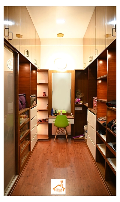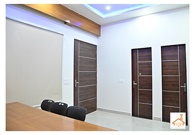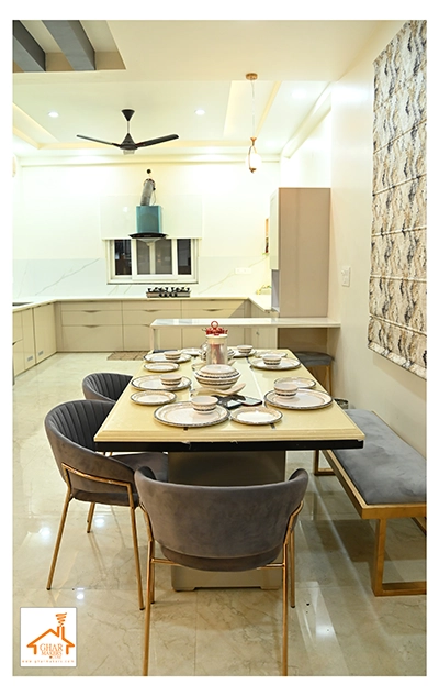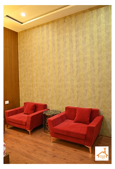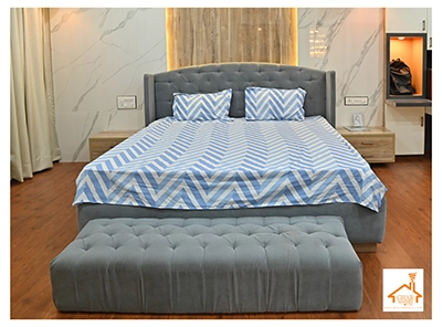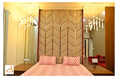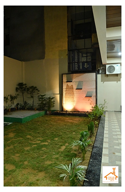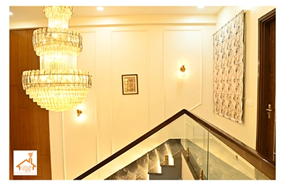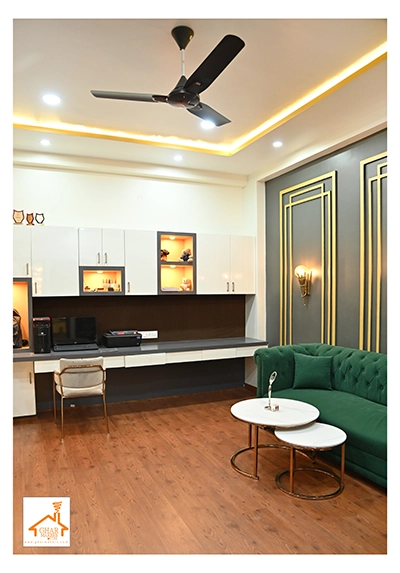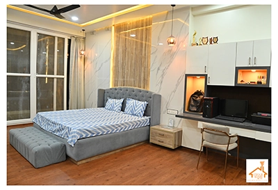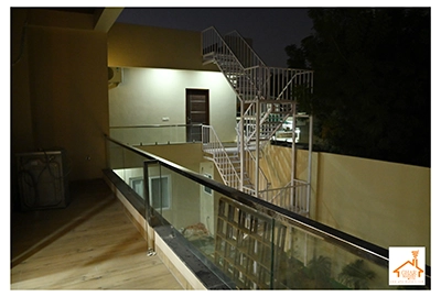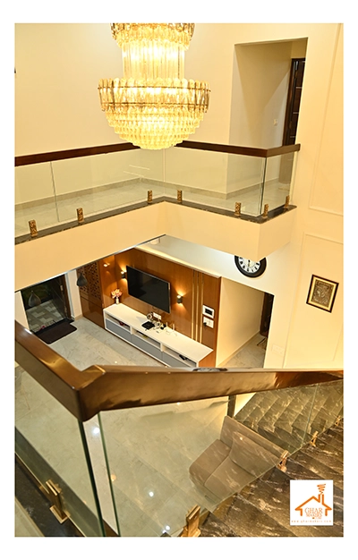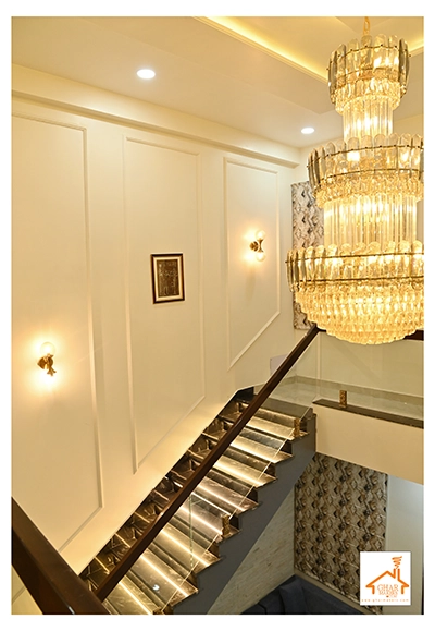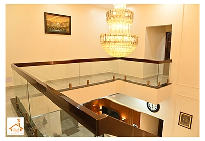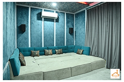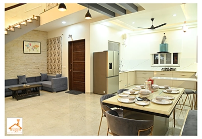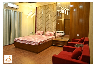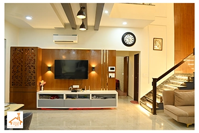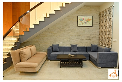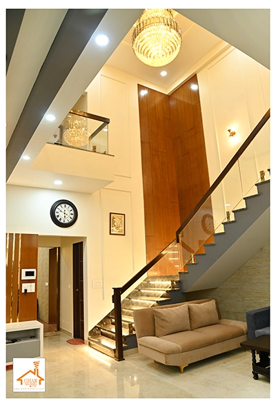A residential duplex, Spatially, the common areas like the living room, dining room, kitchen, lounge, den, office, 1 master bedroom rooms and the main kitchen were on the lower floor, while the private spaces like the 1 bedroom suites, a family room and home theatre were on the upper floor. A colour palate of beige and grey was maintained throughout the villa, allowing the soft furnishings to be the highlight elements adding colour and vibrancy to each space. The master bedroom had an entire wall dedicated to the wardrobe, treated with veneer panelling in a geometrical pattern to create diversity within a unifying material, on which the television was mounted. This removed the need for an entertainment unit, as the controls were placed within the large side table at the bedside. Each of the 2 bedroom suites were delicately treated, embodying the personalities of the people who were to inhabit them. Each suite had 4 sections – the bedroom space, the lounge like space for casual conversation within the room, the walk-in wardrobe and the bathroom. The material used was granite, in polished and river washed finish, to give the pattern to the floor in a subtle fashion. Not to mention the villa consists of Jacuzzi, home theatre, automated lights and home office that opens in the lush green garden with beautiful landscape.