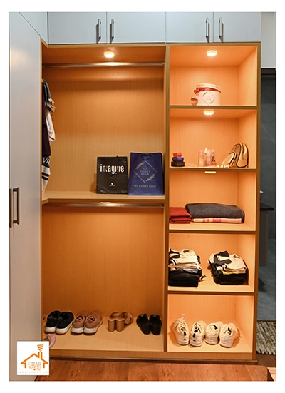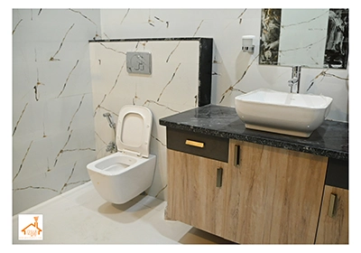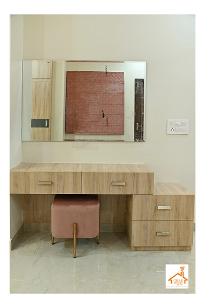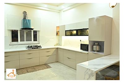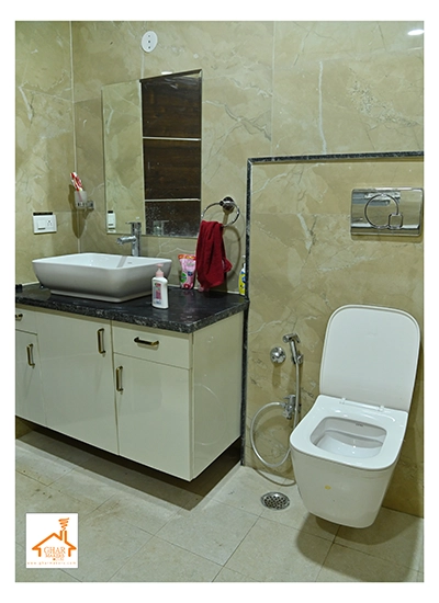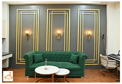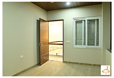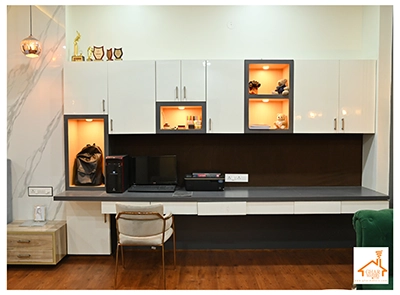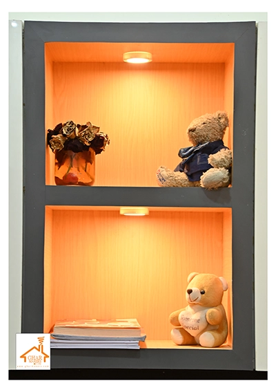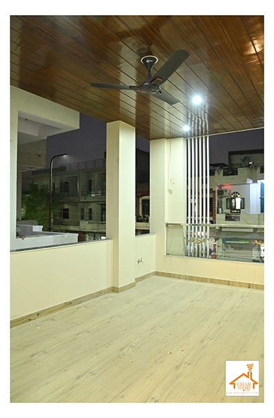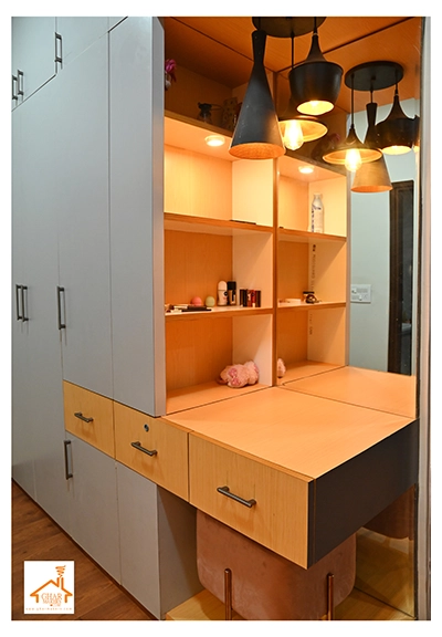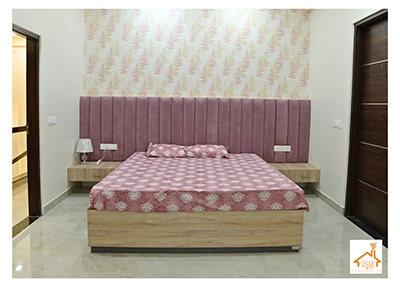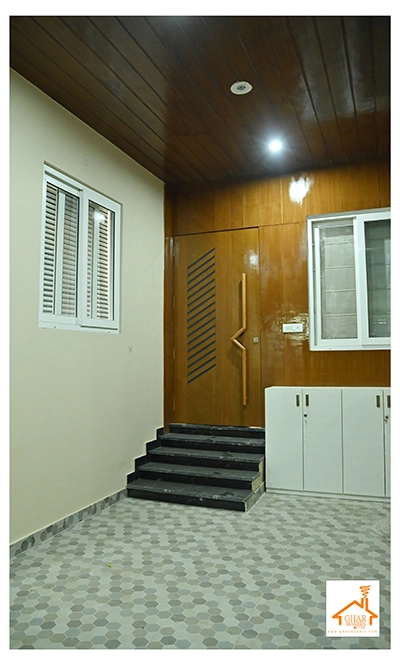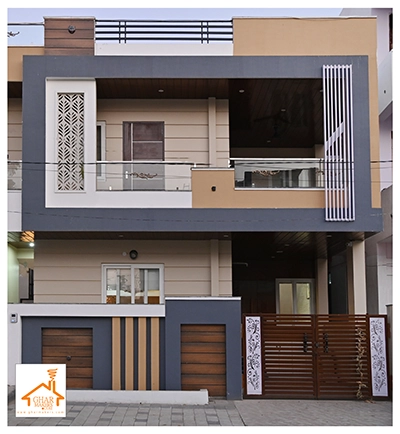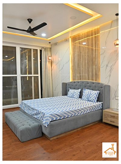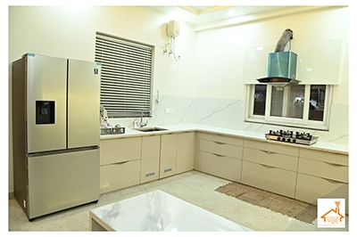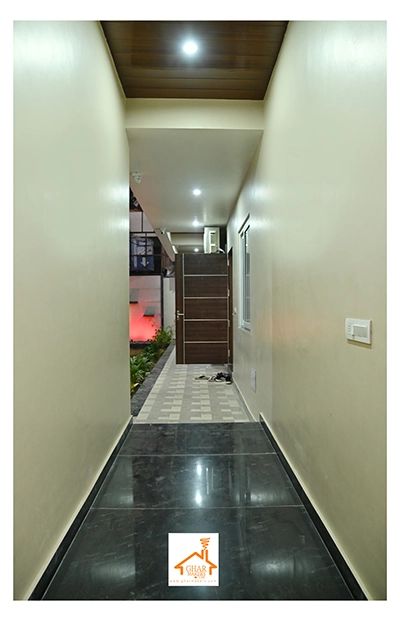 A residential duplex, Spatially, the common areas like the living room, dining room, kitchen, lounge, den, office, 1 master bedroom rooms and the main kitchen were on the lower floor, while the private spaces like the 1 bedroom suites, a family room and home theatre were on the upper floor. A colour palate of beige and grey was maintained throughout the villa, allowing the soft furnishings to be the highlight elements adding colour and vibrancy to each space. The master bedroom had an entire wall dedicated to the wardrobe, treated with veneer panelling in a geometrical pattern to create diversity within a unifying material, on which the television was mounted. This removed the need for an entertainment unit, as the controls were placed within the large side table at the bedside. Each of the 2 bedroom suites were delicately treated, embodying the personalities of the people who were to inhabit them. Each suite had 4 sections – the bedroom space, the lounge like space for casual conversation within the room, the walk-in wardrobe and the bathroom. The material used was granite, in polished and river washed finish, to give the pattern to the floor in a subtle fashion. Not to mention the villa consists of Jacuzzi, home theatre, automated lights and home office that opens in the lush green garden with beautiful landscape.