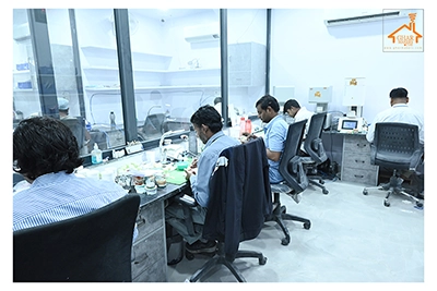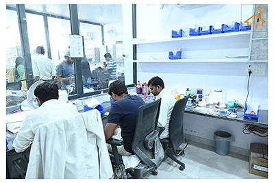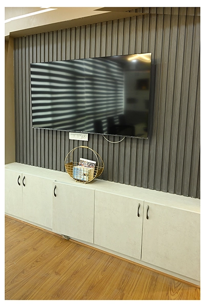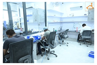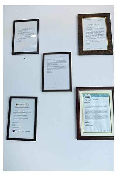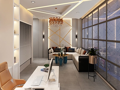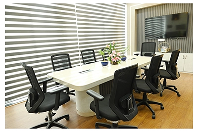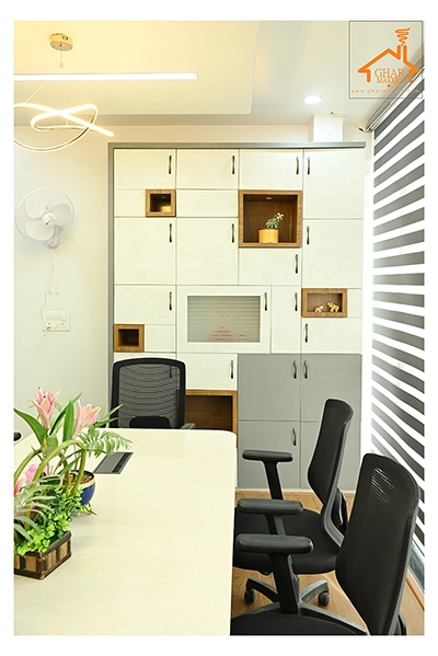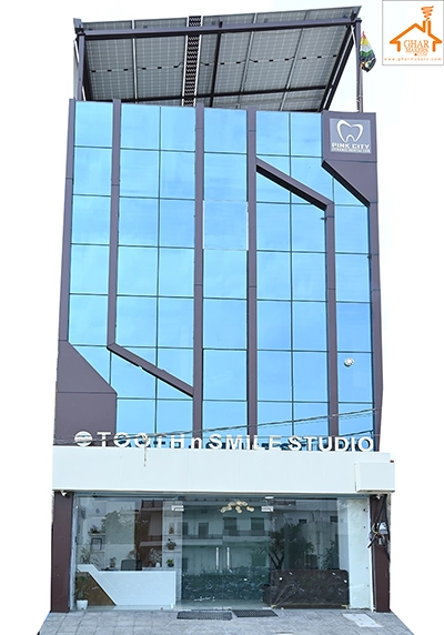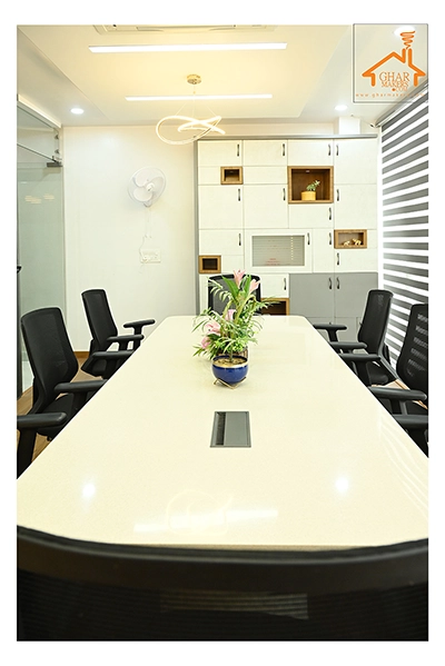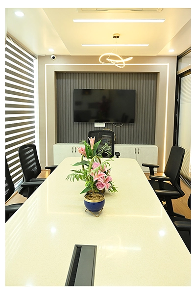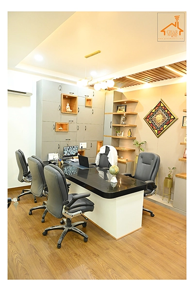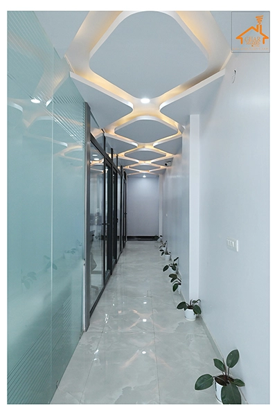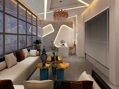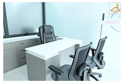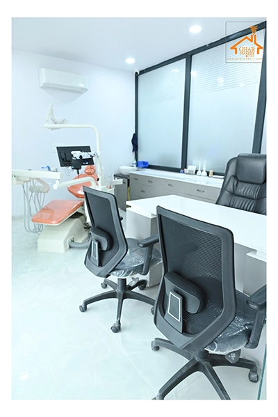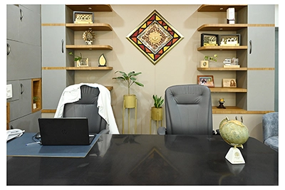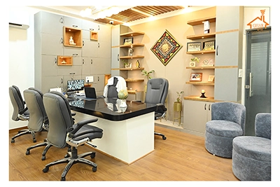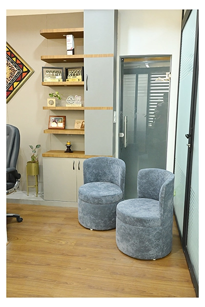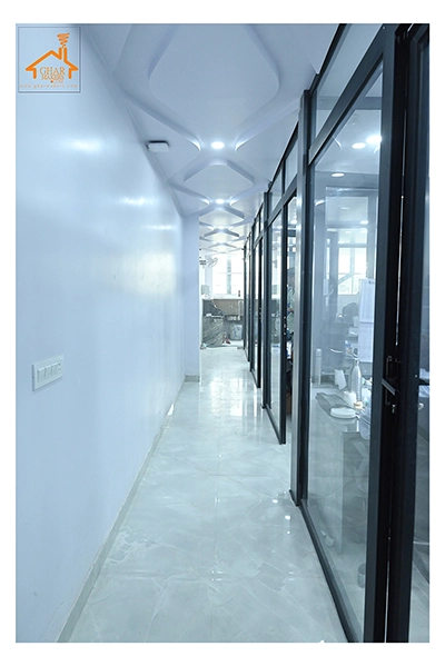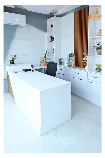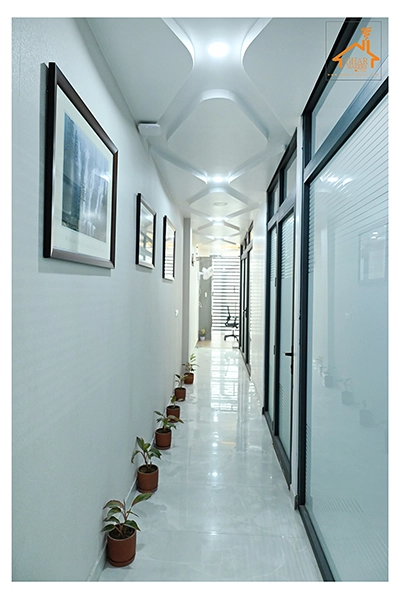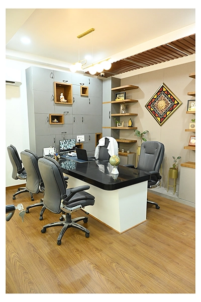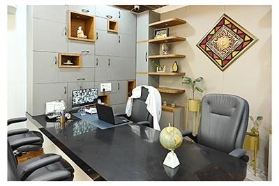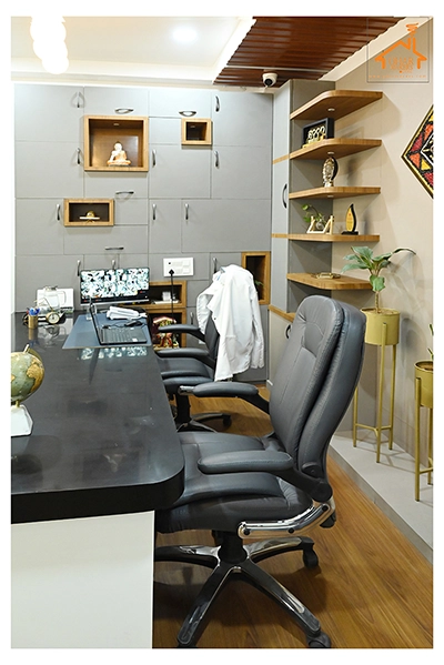 The Clinic is spread over 3 floors and hence there is a different ideology that is applied on each of them. The ground and 1st floor are main the workspace which follows an open format, while the 2nd floor is more for interactions and discussions While full-bodied vitrified tiles were used through most of the office, the main director cabin we used hard wood floors to create plusher ambience. This cabin was divided into 2 zones - the formal conference area and an Individual cabin area for private conversations. The director’s desk has legs made out of wood and top made of Corian sheet. The reception is a well display wall for the products the office, was synonymous with. The waiting area has the entrance towards the examination cabin, while the main staff area and service facilities are housed in the back. On the first floor, the factory setup has been made for the staff with heavy printing machines. Entire building has a cctv and biometrics for proper safety along with this, Elevator facility has been provided on all the three floors. Every floor has been separately designed, keeping the directors cabin the most luxurious one and manager cabin behind that. This project was completed in record time.